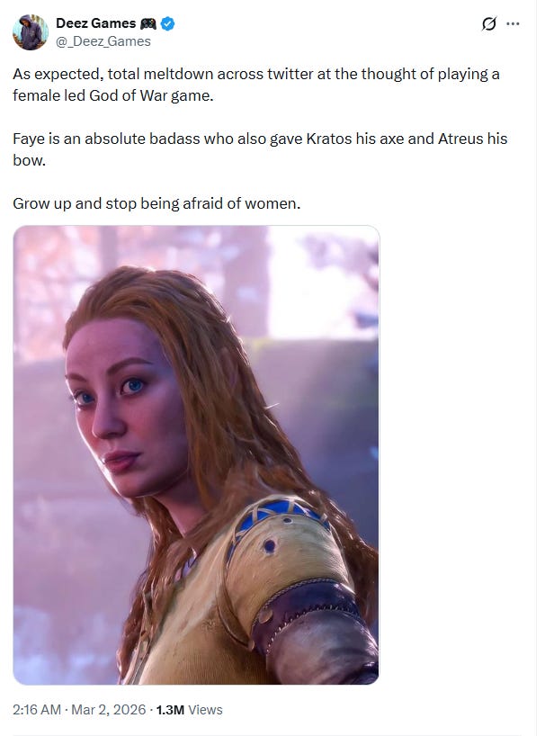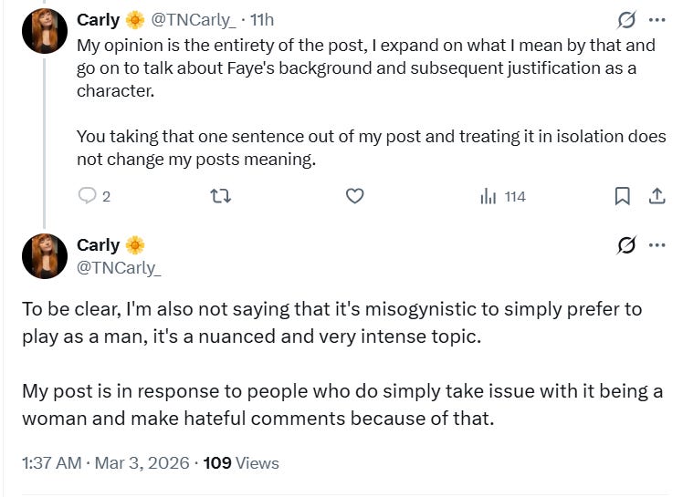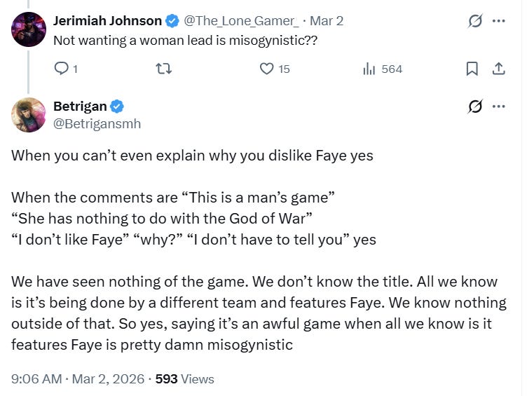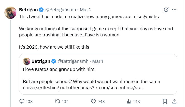 Betrigan wrote, “This tweet has made me realize how many gamers are misogynistic. We know nothing of this supposed game except that you play as Faye and people are trashing it because…Faye is a woman. It’s 2026, how are we still like this.”