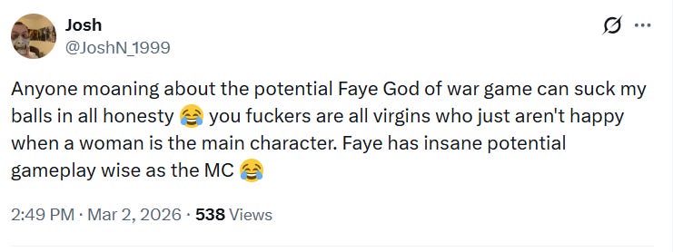 Another maligned gamers, “Anyone moaning about the potential Faye God of war game can suck my alls in all honesty. you [expletive] are all virgins who just aren't happy when a woman is the main character. Faye has insane potential gameplay wise as the MC”