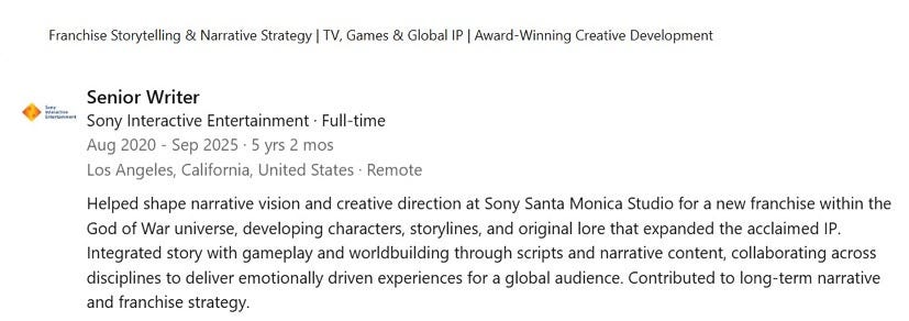 Her profile stated that she “helped shape narrative vision and creative direction at Sony Santa Monica Studios for a new franchise within the God of War universe, developing characters, storylines, and original lore that expanded the acclaimed IP.”