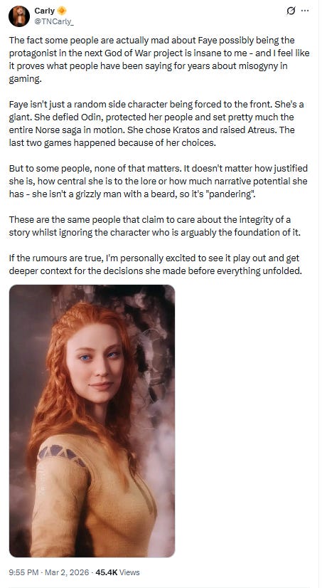 X user TNCarly_ wrote, “The fact some people are actually mad about Faye possibly being the protagonist in the next God of War project is insane to me - and I feel like it proves what people have been saying for years about misogyny in gaming.”