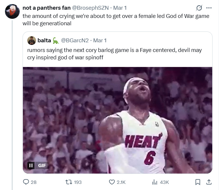Another wrote, “the amount of crying we're about to get over a female led God of War game will be generational.”