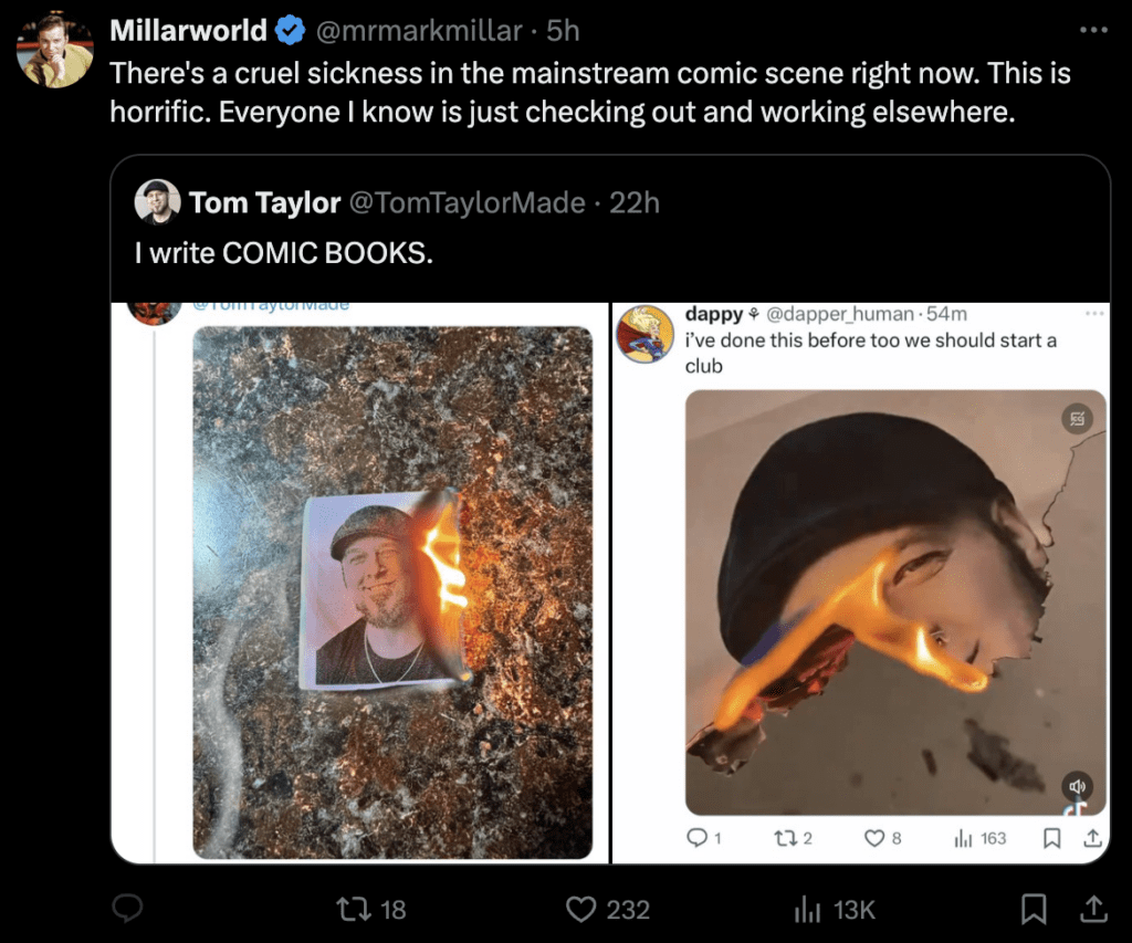 Mark Millar chimed in on the situation with the truth as he usually does, saying, "There's a cruel sickness in the mainstream comic scene right now. This is horrific. Everyone I know is just checking out and working elsewhere."