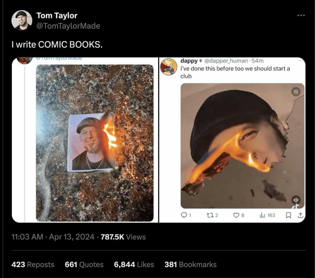 X user @camphobic, whose bio claims to be a lesbian, part of the "Free Palestine" movement, and "not a fan of men," posted an image of Tom Taylor on fire, presumably burned by they/them at some point over not liking one of his storylines.