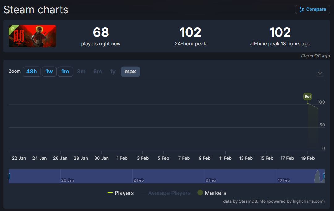 The Demo for the game, which was released on February 19th only managed to hit a 24-hour peak of 102 players. As of writing, the game currently has just 68 players playing.
