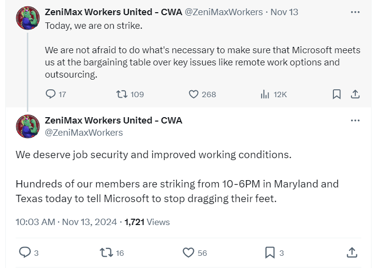 The union announced on X on November 13th, “Today, we are on strike. We are not afraid to do what's necessary to make sure that Microsoft meets us at the bargaining table over key issues like remote work options and outsourcing.”