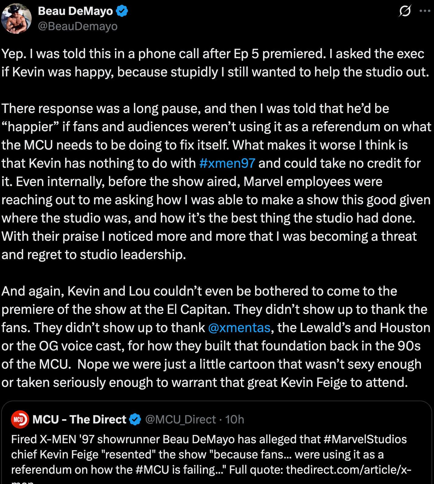 Yep. I was told this in a phone call after Ep 5 premiered. I asked the exec if Kevin was happy, because stupidly I still wanted to help the studio out. There response was a long pause, and then I was told that he’d be “happier” if fans and audiences weren’t using it as a referendum on what the MCU needs to be doing to fix itself. What makes it worse I think is that Kevin has nothing to do with #xmen97 and could take no credit for it. Even internally, before the show aired, Marvel employees were reaching out to me asking how I was able to make a show this good given where the studio was, and how it’s the best thing the studio had done. With their praise I noticed more and more that I was becoming a threat and regret to studio leadership. And again, Kevin and Lou couldn’t even be bothered to come to the premiere of the show at the El Capitan. They didn’t show up to thank the fans. They didn’t show up to thank @xmentas, the Lewald’s and Houston or the OG voice cast, for how they built that foundation back in the 90s of the MCU. Nope we were just a little cartoon that wasn’t sexy enough or taken seriously enough to warrant that great Kevin Feige to attend."