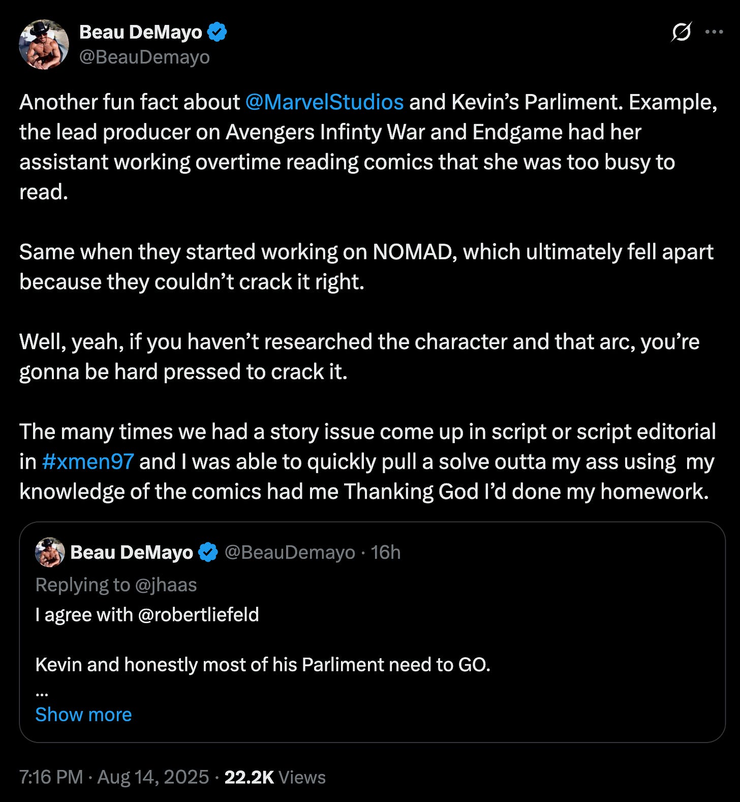 Beau DeMayo is the embattled former showrunner for Disney+’s X-Men ‘97 cartoon, fired last year, and he’s unloading on Marvel Studios and Kevin Feige on X after feeling slighted for his firing.