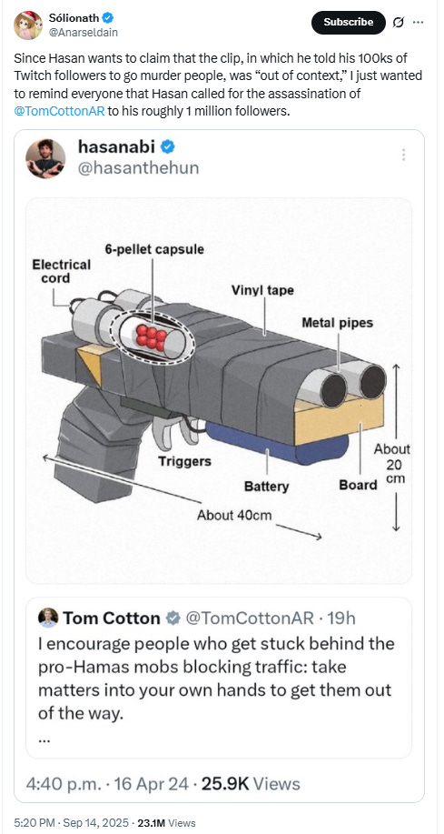 X user Anarseldain appeared to react to these comments and wrote, “Since Hasan wants to claim that the clip, in which he told his 100ks of Twitch followers to go murder people, was ‘out of context,’ I just wanted to remind everyone that Hasan called for the assassination of Tom Cotton to his roughly 1 million followers.”