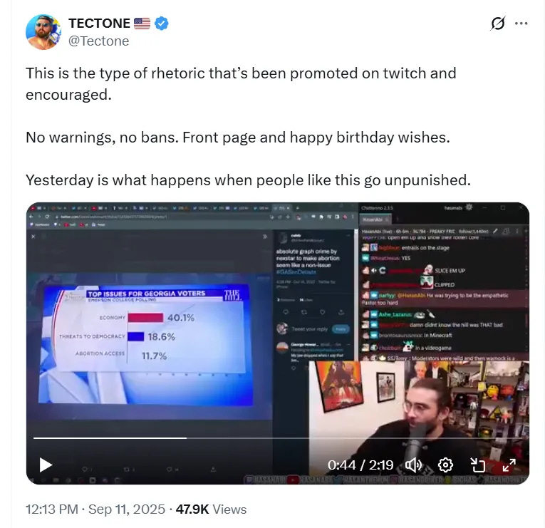 Tectone posted on X, “This is the type of rhetoric that’s been promoted on twitch and encouraged. No warnings, no bans. Front page and happy birthday wishes.”