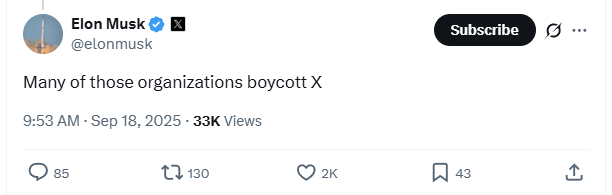 Elon Musk responded to the post writing, “Many of those organizations boycott X.”
