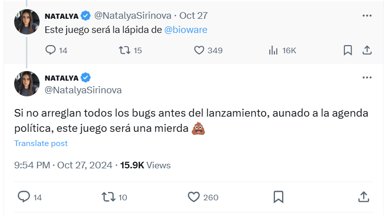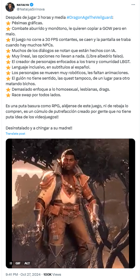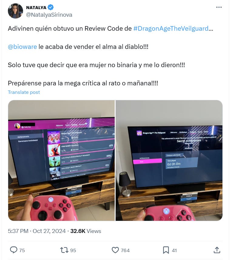 As translated by Google, she wrote on X, “Guess who got a Review Code from Dragon Age: The Veilguard. BioWare just sold his soul to the devil!!! I just had to say I was a non-binary woman and they gave it to me!!! Get ready for the mega review soon or tomorrow!”