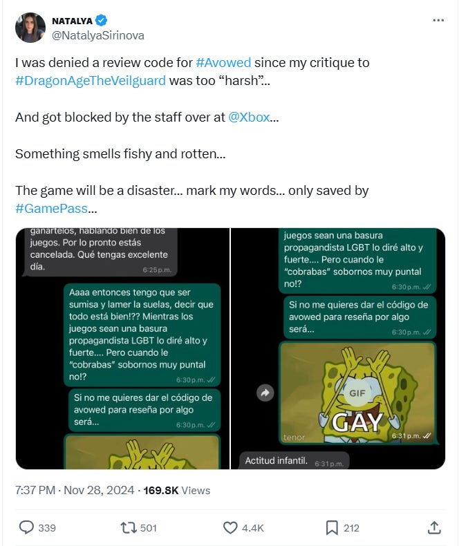 Spanish-language reviewer Natalya Sirinova reported that Obsidian Entertainment and its parent company Xbox denied her a review code due to her “harsh” criticism of Dragon Age: The Veilguard.