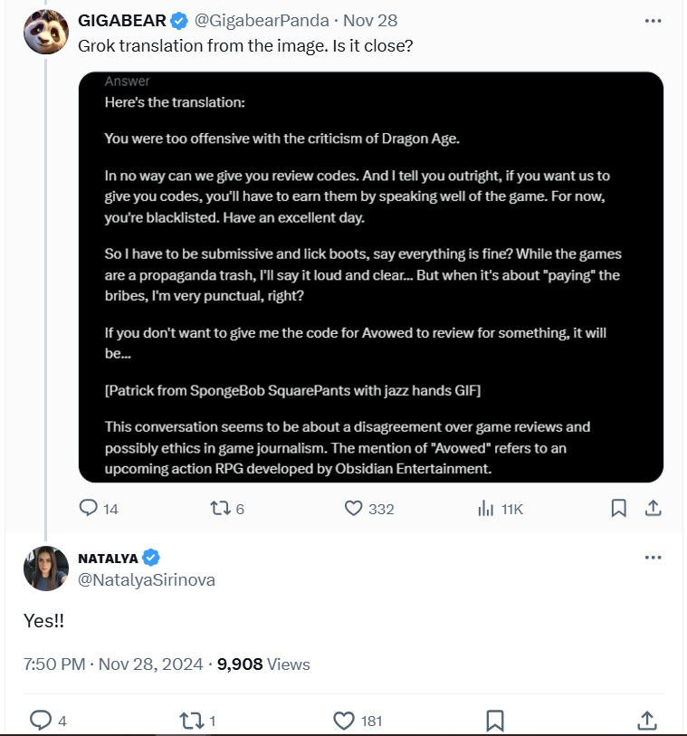 She wrote on X, “I was denied a review code for Avowed since my critique to Dragon Age: The Veilguard was too ‘harsh’…”