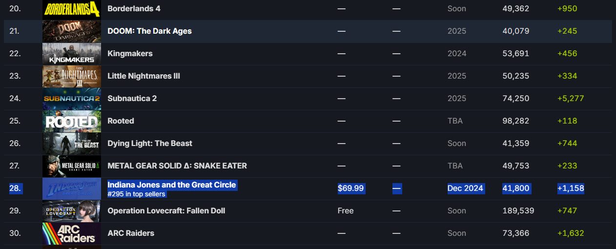 Furthermore, Indiana Jones and the Great Circle appears to be on a trajectory worse than Dragon Age: The Veilguard. The game currently only has 41,800 follows and is listed 28th on SteamDB’s Most Wishlisted Upcoming Steam Games list and 295th in top sellers despite being released in less than a month on December 9, 2024.