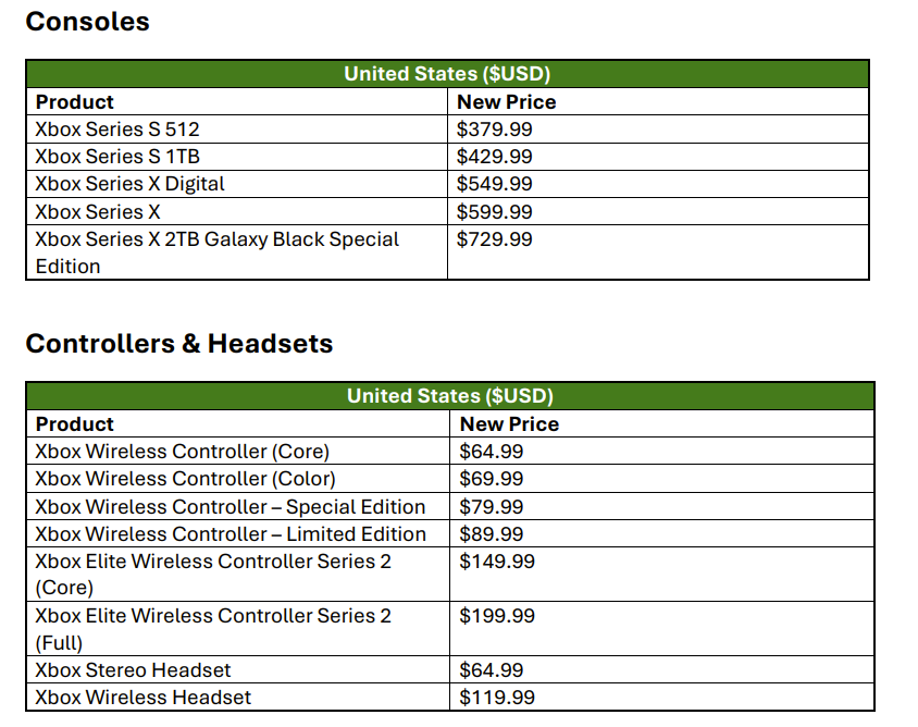 It then shared the various prices it is recommending to retailers. In the United States, the Xbox Series X has increased to $599.99 with the 2TB Galaxy Black Special Edition increasing to $729.99.