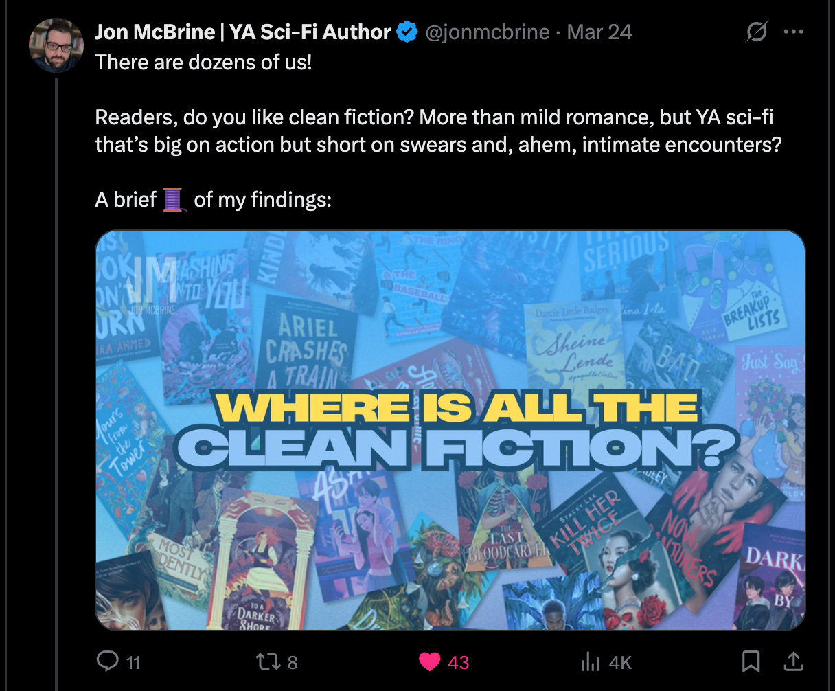 McBrine posted to X, “Readers, do you like clean fiction? More than mild romance, but YA sci-fi that’s big on action but short on swears and, ahem, intimate encounters?”