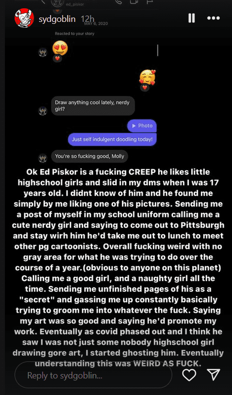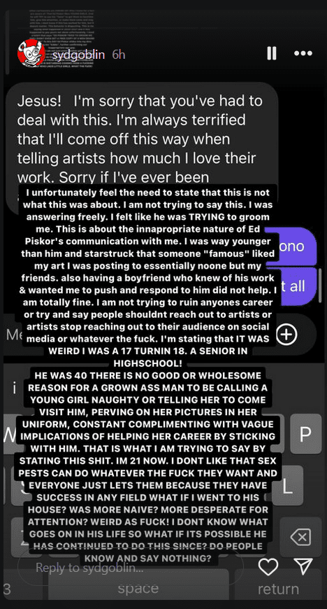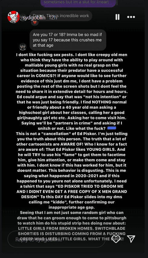 Now, Ed Piskor is falling under scrutiny because of DMs dropped by @sydgoblin, an artist who claims he was flirting with her when she was 17 years old. In an Instagram story, sydgoblin states, “OK, Ed Piskor is a f***ing CREEP he likes little highschool girls and slid I my dms when I was 17 years old. I didn’t know him and he found me liking one of his pictures.”