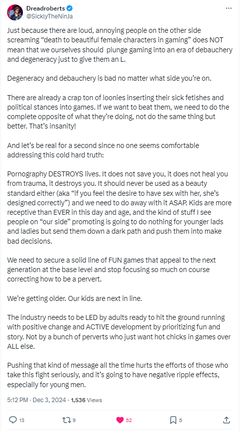 In a post to X, Dreadroberts wrote, “Just because there are loud, annoying people on the other side screaming ‘death to beautiful female characters in gaming’ does NOT mean that we ourselves should plunge gaming into an era of debauchery and degeneracy just to give them an L. Degeneracy and debauchery is bad no matter what side you’re on.”