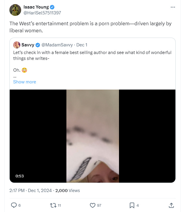 He wrote, “The West’s entertainment problem is a porn problem—driven largely by liberal women.”