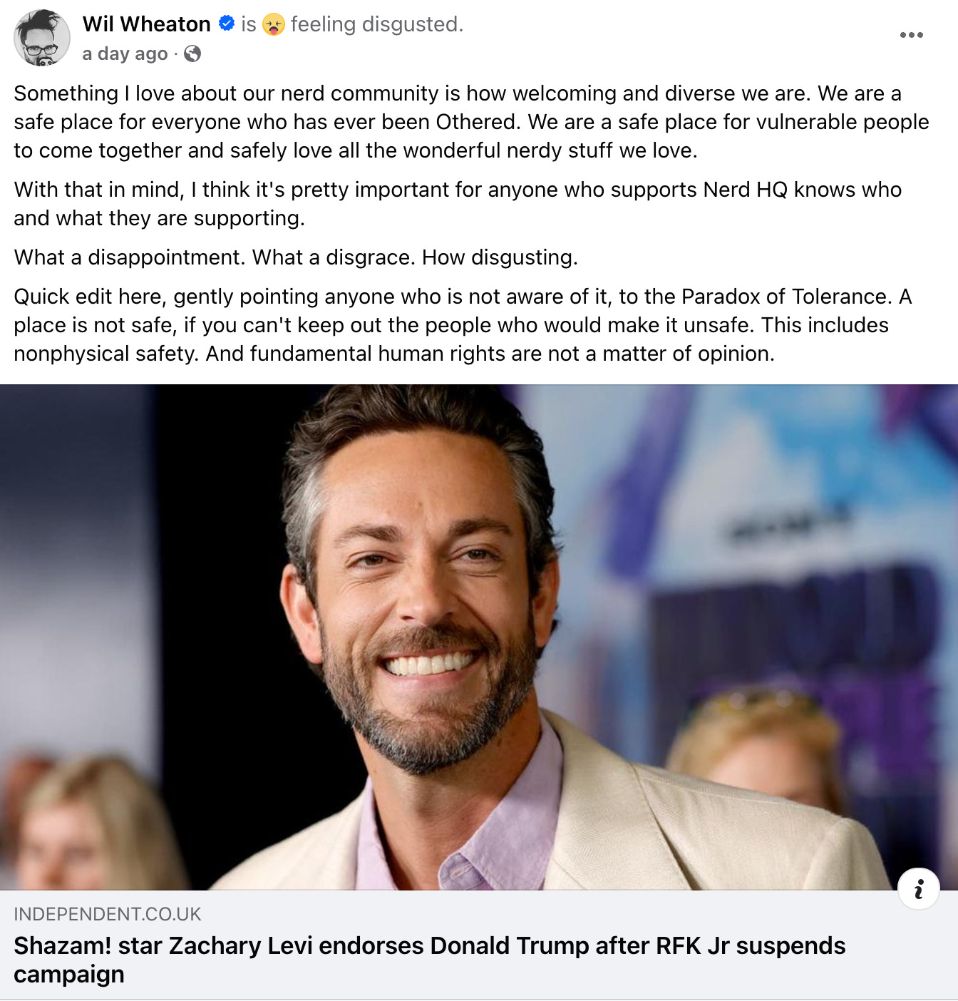 On Facebook, Wil Wheaton posted: “Something I love about our nerd community is how welcoming and diverse we are. We are a safe place for everyone who has ever been Othered. We are a safe place for vulnerable people to come together and safely love all the wonderful nerdy stuff we love.”