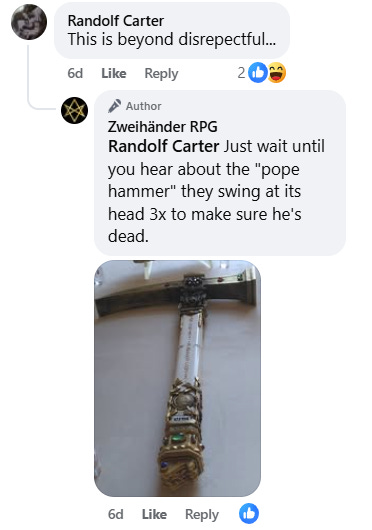 When one individual noted how disrespectful the post was, Zweihander RPG doubled down saying, “Just wait until you hear about the ‘pope hammer’ they swing at its head 3x to make sure he's dead.”