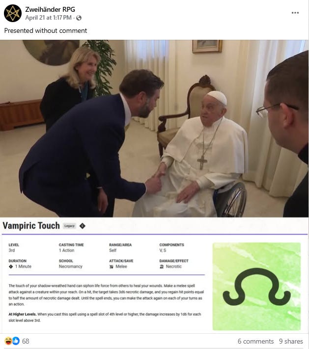 The official Zweihander RPG Facebook page shared a photo of Vice President of the United States J.D. Vance meeting with Pope Francis on the day before his death and shaking hands with him.