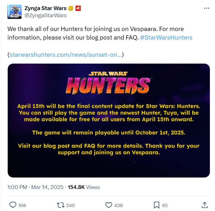 In a post to social media, the company announced, “April 15th will be the final content update for Star Wars: Hunters. You can still play the game and the newest Hunter, Tuya, will be made available for free for all users from April 15th onward.”